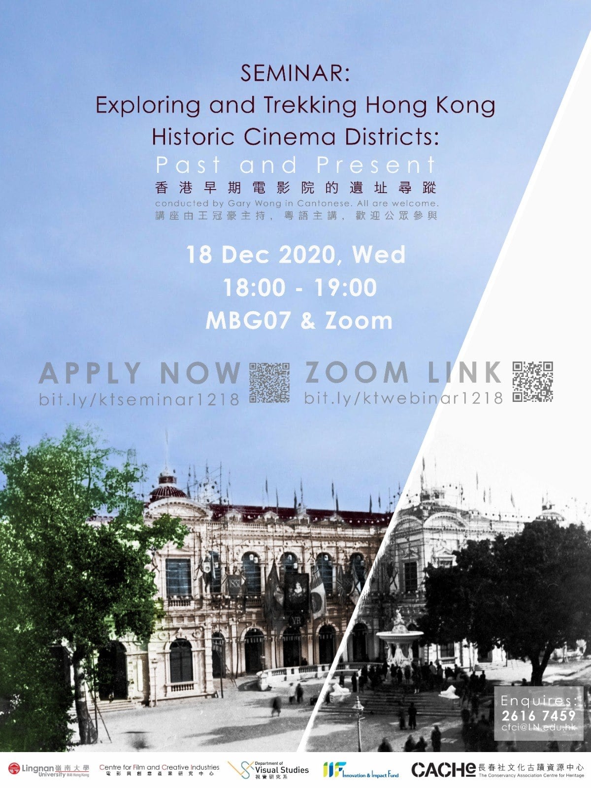 內容:活動由嶺南大學電影及創意媒體研究中心主辦,根據中心研究項目「香港殖民時期的電影放映」採集所得的史料,把當下的中環與過去聯繫在一起。該研究發掘了1897年至1920年代期間電影放映最具代表性的歷史遺跡,活動會以當代香港電影史與城市變遷來補充,輔以場景與電影介紹,與大家在光影的時光隧道中漫遊一小時。