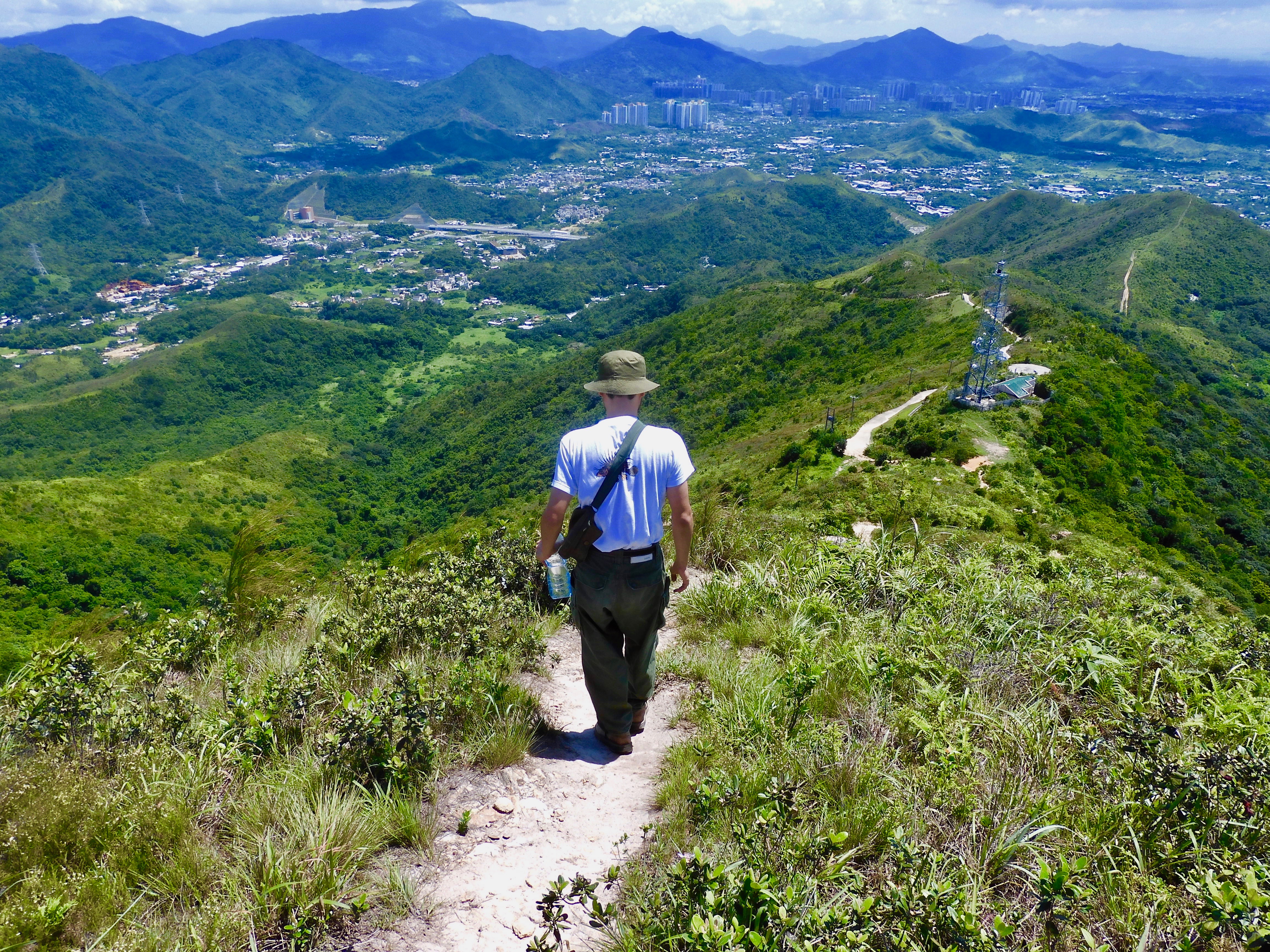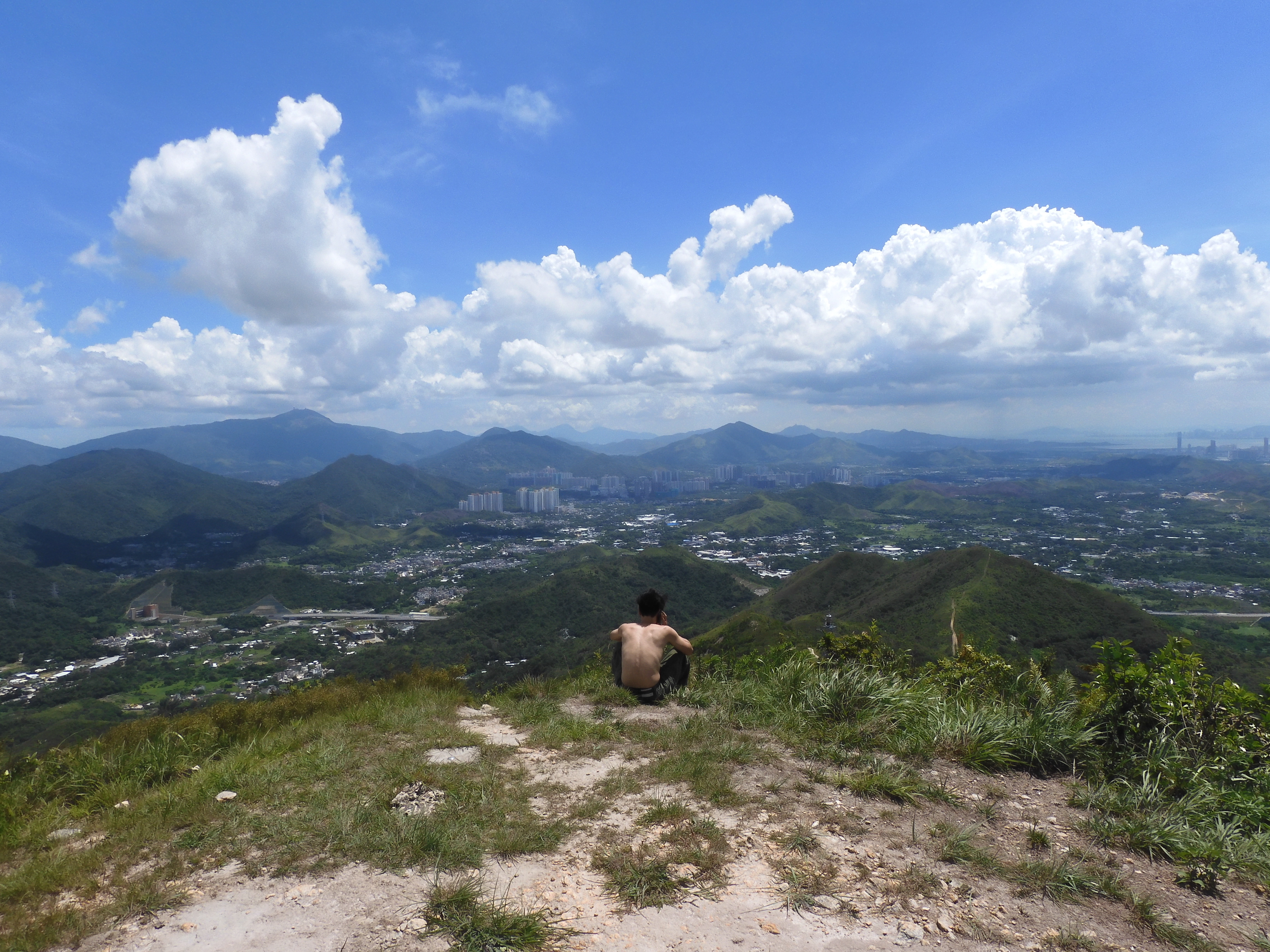 在「沙甸魚」現場打過咭後,回頭循原路上山,沒多久便正式登頂,那是片中眾士兵休息煲煙的地方,眾人背著遼闊的港中邊界,討論茫茫前路。該處360度的壯麗景觀美不勝收,令人忘卻上山的辛苦。在山上,我用「手捲煙」皮套裝著的火機為導演點一根手捲煙,聽他講場景的點滴。