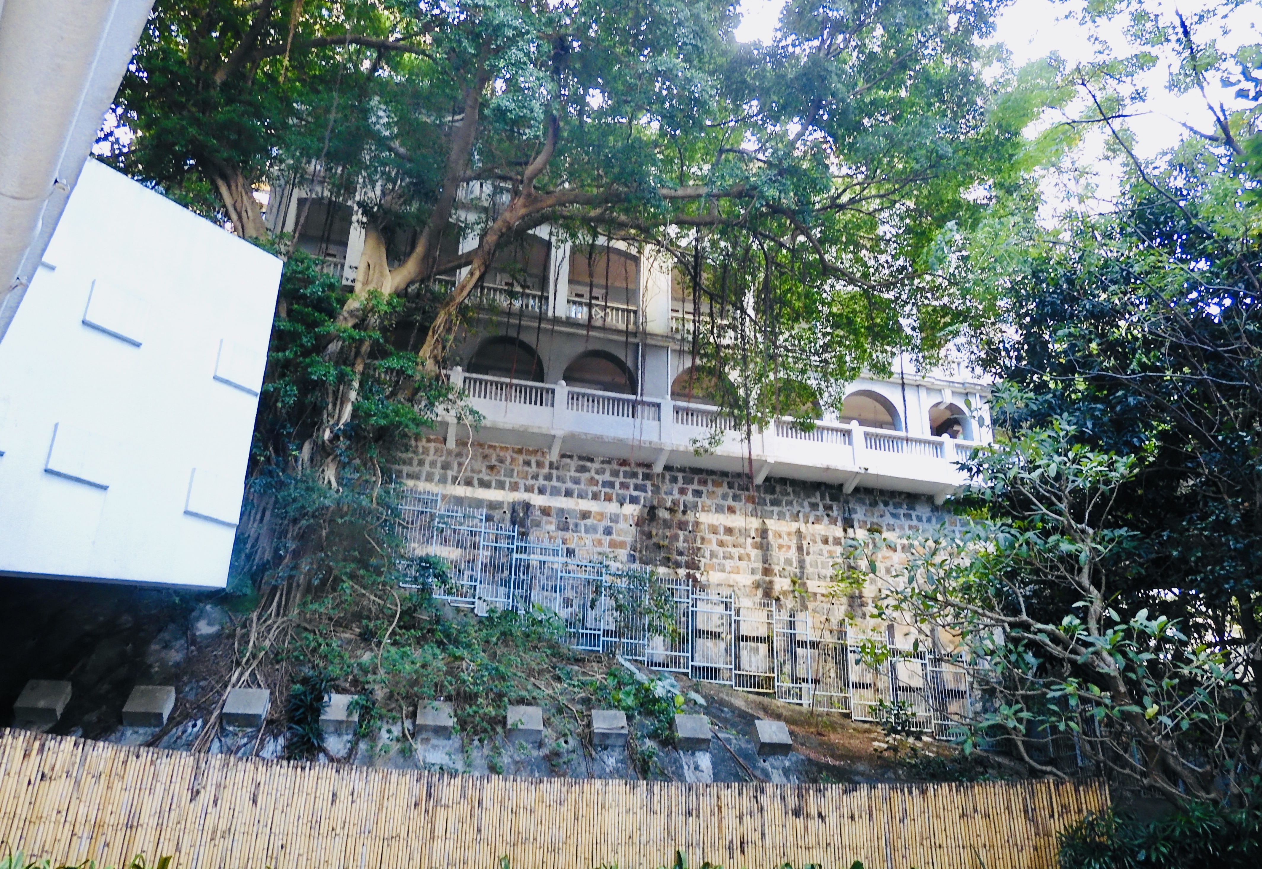 學生會的轉角位是一幅石牆,牆上佇立一座外號「白屋仔」的歷史建築,名字叫倫敦傳道會大樓,約建於1893年,是香港二級歷史建築。大樓原屬於英華女校的範圍,但後來相關地段賣了給地產商,現址屬於新建豪宅的範圍,成了屋苑住客會所的圖書館。