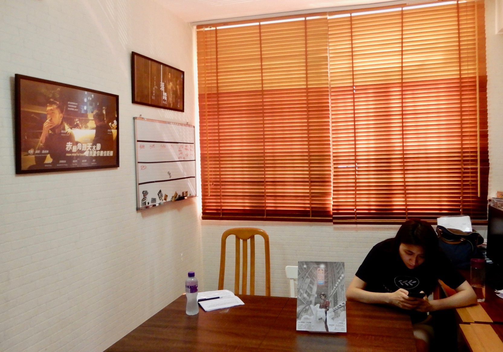 《填詞L》的預算除了比《金都》更低,製作過程也相對複雜,有動畫,也多了人物和場景,時間更橫跨10年。在限米煮限飯的處境下,又想煮出燒鵝的味道,當中最直接有效的方式是慳,首先是從拍攝場景中落手。「第一個著手點是找場地贊助,例如龍華酒店,因為有NGO的關係有場地贊助而無需租金,電影中的café因為是朋友的地方,所以也不用租金,我們的宗旨是那裡免費那裡拍,當中有一個地方更充當3個景,即片中Hong Kong free rider的Office、羅穎詩(鍾雪瑩)攞獎的Office和電台的Office都是同一個景,我們用拍攝的角度去遷就,這樣轉景也同時慳了時間。」